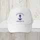 O chapéu de capitão de barco com tema náutico, com ilustração de uma âncora azul-marinho clássica e seu nome e nome do seu barco em elegante marinho azul.