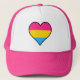 Trucker Hat Rosa Quente com design de coração em cores de pansexualidade; bandeira de orgulho rosa, amarela e azul, design de amor do arco-íris