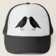 Este chapéu espetacular apresenta uma imagem de arte digital de um par de lindos ravens negros virados um para o outro e parecendo que estão se beijando. Eles são pretos com olhos-de-luz e cinzas-bicos e pés.