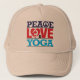 Estado o que é realmente importante para você com este chapéu que caracteriza as palavras "paz, amor, e ioga". A letra "c" na paz da palavra for substituída com um sinal de paz, quando o coração que substitui a letra "O" no amor, contem uma silhueta de uma mulher que faz uma pose da ioga. Disponível com produtos de harmonização.