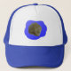 Um chapéu azul e branco com uma foto de uma jovem garganta africana sentada em um lago azul digitalmente criado. Esta design também está disponível em todas as outras cores do chapéu.