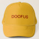 O CHAPÉU AMARELO DIZ "DOOFUS" EM LETRAS VERMELHAS