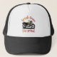 Um chapéu com uma motocicleta retrô, com a frase "Quebre a Rotina" centrada em torno da imagem. O design sugere um senso de aventura e liberdade, oferecendo uma fuga pacífica da rotina diária.