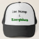 Chapéu do estilo do camionista com "amor, vingança & zombis" através da parte dianteira.