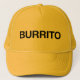 Divertimento do BURRITO e slogan irónico no chapéu do camionista, preto, indicação tipográfica engraçada, inspirada pelo rossitano da franquia do caráter da comédia da tevê. uma palavra. burrrrito.