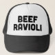 MELHORE o divertimento do RAVIOLI e o slogan corajoso no chapéu do camionista, preto, irónico, tipografia, indicação engraçada, inspirada pelo rossitano da franquia do caráter da tevê. ravioli beefy. massa do dat.
