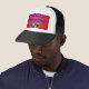 Um chapéu com o compartimento de Kansas nele em letras azuis que é brilhante e colorido. Isso tem um fundo vermelho.