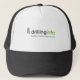 Chapéu com logotipo no fundo branco com detalhes pretos.