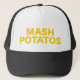 TRITURE o divertimento de POTATOS/BATATAS e o slogan corajoso no chapéu do camionista, amarelo, tipografia irónica, indicação engraçada, inspirada pelo rossitano da franquia do caráter da tevê. triture que batatas e quebra.