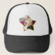 Chapéu preto e branco do estilo do camionista que caracteriza o logotipo da estrela de Ashley Collins.