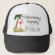 Este chapéu do camionista do flamingo e da palmeira é o chapéu perfeito para seu partido temático da reunião de família do flamingo. Personalize com seu nome de família, o ano, e o lugar da reunião.