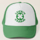 Emblema verde e branco do círculo com encanto afortunado no texto redondo circular. Trevo do trevo de quatro folhas para a sorte do irlandês! © www.CuteComfy.com de Copyright