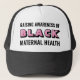 Este é um boné motivacional de baseball para aumentar a conscientização sobre as questões em torno da saúde materna negra, especialmente a alta taxa de mortalidade no parto entre os afro-americanos e Caribes africanos nos EUA e no Reino Unido. Design diz SENSIBILIZAR A SAÚDE DE MATERNO NEGRO na tipografia a preto e rosa.