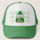 Coruja bonito e adorável com seu chapéu pequeno do leprechaun nas máscaras da obscuridade e da luz - esverdeie, com uma curvatura amarela. Este pássaro está pronto para comemorar o dia de St Patrick no estilo. Esverdeie no verde com um fundo colorido luz do trevo. Excelente para os fãs e os coletores animais da coruja. © de Copyright do design www.CuteComfy.com 2013