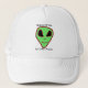 Chapéus com uns trabalhos de arte de uma alienígena verde, com a frase "crente da vida em outros planetas".