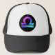 O chapéu do camionista desportivo da malha do Libra, sinal magenta roxo azul do zodíaco do libra na crista preta do círculo. Outras cores do chapéu estão igualmente disponíveis. Você pode personalizar este design se desejado (clique "personalizam" o botão abaixo da imagem de produto) adicionar o texto, movimento ou resize imagens, resize ou suprimir do fundo, de bênçãos felizes etc. do dot com bom de desejo feliz.