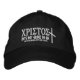 Design branco bordado no boné preto ajustável. Cristos está escrito em grego para a peça sobre palavras, "Ele não é grego para mim." Exclusivamente em Biblewhiz.com.