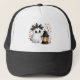 This enchanting design features a cute ghost wearing a stylish floral crown, gently leaning on a black lantern with a glowing Jack-O'-Lantern. Surrounded by delicate fall foliage, this whimsical trucker hat is perfect for Halloween, autumn lovers, and anyone who enjoys spooky-cute aesthetics.