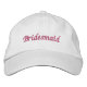 Boné de beisebol ajustável básico de roupa alternativa com bordado personalizado na cor branca com texto "Bridesmaid" em tipografia de letras rosa e design gráfico digital por TheFabricSeal loja de impressão sob demanda no Zazzle.com #ZazzleMade https://www.zazzle.com/store/thefabricseal TheFabricSeal Original.