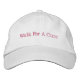 Mostre seu apoio à luta contra o cancer da mama com este boné mostrado em branco com um texto bordado cor-de-rosa: Caminhe por uma Cura.