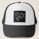 Este boné tem um design de três estrelas judaicas nas cores de néon em um fundo preto.