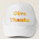 As palavras "Dê Obrigados" foram desenhadas a partir de uma foto de um lírio amarelo e são impressas em bonés. Uma maneira excelente de afirmar.