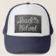 Foto de um quadro-negro com a mensagem "Voltar à escola" em giz branco é mostrada neste chapéu de caminhoneiro. Vista-se ou dê como presente a um professor, estudante, motorista de ônibus e mais, ajustável e disponível em combinações de 12 cores!