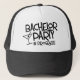 Equipe todas as caras em seu despedida de solteiro com este chapéu do camionista do despedida de solteiro que caracteriza um vidro de martini e o lê, "despedida de solteiro em andamento" em um divertimento, pia batismal retro.