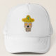 Este incrível chapéu apresenta uma imagem design gráfica de um Dia Mexicano dos Mortos (Dia de los Muertos) inspirado no crânio. O crânio é uma cinza pálida e está vestindo um sombrero amarelo. Ela tem dentes de ouro e girassóis mexicanos, também chamados de titonias em vez de olhos. O sombrero tem um cacto e está coberto por padrões de espiral bonito e pimentões-do-sul e vermelhos. O próprio crânio está coberto por flores bonito e coloridas de diferentes tipos.