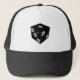 O desenho animado estimula o desenho de crânios em um dado. Chapéus de caminhoneiro para homens e mulheres. Ideia do presente.