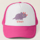 Um chapéu bonito para o esse tem uns desenhos animados de um dinossauro roxo do triceratops com os olhos redondos grandes, e chifres do rosa em sua cabeça. Excelente para quem amor os temas pré-históricos ou jurássicos! Personalize com nome de s.