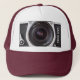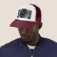 Vestir "uma came principal" em sua cabeça com este chapéu que caracteriza a imagem de um preto retro e do namorando da câmera de reflexo da única (SLR) lente do cromo dos anos 70 ou do 80s. A câmera do preto e do cromo tem um efeito filigrana do rolo gravado no corpo circunvizinho do cromo. Não é uma câmera real; mas uma imagem digital impressa no tecido.