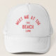 Encontre-me na praia é o chapéu perfeito para o seu passeio na praia. Letreiro da praia em vermelho desgastado. Personalize com os detalhes da sua viagem à praia... ano e destino da praia. Perfeito para uma viagem à praia com a família ou amigos ou despedida de solteira no clube da praia ou como um lembrete de uma viagem passada. Acessórios correspondentes disponíveis na Coleção de Listras do Cabana Amarelo Encontre-me na Praia.