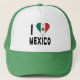 Boné de caminhoneiro com uma bandeira mexicana em forma de coração em vez da palavra AMOR. O design lê EU AMO MÉXICO. A bandeira é verde, branca e vermelha com uma águia no centro. Favor divertido para celebrações do Cinco de Mayo ou qualquer ocasião especial.