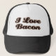 Este produto foi feito para todo o amante do bacon! Caracteriza um fundo do redemoinho do bacon, com o texto "que eu amo o bacon" na parte superior.