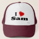 Eu amo Sam! É seu nome Sam? Você tem uma esposa, um namorada, um membro da família fêmea ou um amigo fêmea que você saiba amores você? Ou você tem um marido, um namorado, um membro da família masculino ou um homem Sam nomeado amigo quem você ame profundamente? Em caso afirmativo, este "que eu amo" o chapéu é exatamente o presente que você está procurando! As características de design a letra "mim" na rotulação preta com um coração vermelho na parte superior e no "Sam" na rotulação preta na parte inferior.