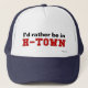 Eu preferencialmente estaria na H-Cidade! É você de Houston, Texas? Você tem um amigo ou um membro da família que amem Houston, Texas? Em caso afirmativo, isto "eu preferencialmente estaria em…" o chapéu é o que você está procurando! As características de design "eu preferencialmente estaria em" na rotulação preta pequena na parte superior e na "H-Cidade" na rotulação vermelha grande na parte inferior.