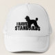 Este design lê, "eu tenho padrões" e caracterizo a silhueta de uma caniche padrão. Está disponível em canecas, em copos, em t-shirt, em chapéus, em etiquetas e em mais.