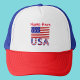 Caminhoneiro personalizado que possui a bandeira dos Estados Unidos da América, ou bandeira americana com as letras EUA abaixo, em vermelho, branco e azul, com estrelas e listras, encontradas na bandeira. Personalize o chapéu do caminhoneiro adicionando um nome, para você mesmo ou um presente criativo. Excelente para grupos viagem, clubes ou reuniões familiares. presente divertido para qualquer ocasião ou evento. Pai adoraria por Dia de os pais. Divertido de vestir no Dia da Independência/4 de julho.