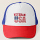 Este estilo de caminhoneiro é mostrado em vermelho, branco e azul com um patriótico impressão veterano da bandeira dos EUA. Personalize este chapéu ou comprar como está. Imagem do stock