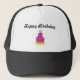 Feliz Aniversário Deseja com o Chapéu ou Boné do Caminhoneiro da Imagem de Bolo. Bonitos Chapéus para quem vai celebrar o Aniversário. Um caminhoneiro branco e preto que geralmente se refere a um estilo de chapéu que tem uma malha traseira e um painel frontal sólido. O painel frontal pode ser dividido em duas cores: branco na frente e preto na borda e possivelmente em outras partes do chapéu. Os chapéus de caminhoneiro são caracterizados por seus fechos ajustáveis de snapback ou Strapback, bordas curvas e a parte traseira do engate que fornece ventilação. Eram originalmente populares entre camionistas e trabalhadores que precisavam de um chapéu confortável e respirável para atividades ao ar livre. A combinação de branco e preto é uma escolha clássica e versátil que pode combinar várias roupas e estilos. Estes chapéus são geralmente vestidos casualmente e são populares entre as pessoas que querem um olhar de repouso e desportivo.