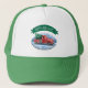 Este chapéu apresenta uma cena de inverno de um clássico caminhão vermelho que caminhava pela neve, uma nova árvore de Natal no fundo. Uma faixa verde acima tem o texto "Feriados Felizes".