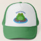 Este sapo verde giro e feliz sentado em uma almofada de lírio roxa é brilhante e adorável. Muita diversão anfíbia desenhada no estilo de animação feliz.