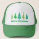 Uma fila de árvores geométricas de abeto. O céu está marinho com neve branca caindo. O texto diz "Feliz Natal" a verde.