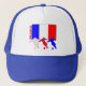 Três jogadores de futebol jogam em frente à bandeira francesa. Nome do país França está do lado