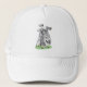 This all white hat features a stylish gray watercolor golf bag filled with clubs, sitting on a patch of green grass. The design includes a simple serif initial monogram placed right on the bag, making it feel like a natural part of the artwork. The letter is shown in a dark gray, almost black, to match the bag’s accents, but you can change it to any color you prefer.
