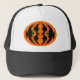 Este maldito chapéu de Halloween apresenta um oval laranja com seis corvos. Cada corvo tem olhos amarelos com pupilas pretas e asas salientes. Os corvos voam em direção uns aos outros formando uma forma oval.
