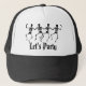 O chapéu de caminhoneiro de Halloween mostrado em preto e branco com um impressão de esqueletos dançantes bonitos. Comprar como está ou personalizar.