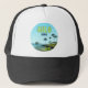 Vista a costa de rocha vulcânica jagada e palmeiras de Hilo, na Ilha Grande do Havaí, EUA, com um chapéu como recordação de um dos maiores sítios da América!