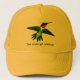 Ilustração cartoonesa de beija-flor com palavras de apoio, "Esta ave tem atitude" (intenção dupla).